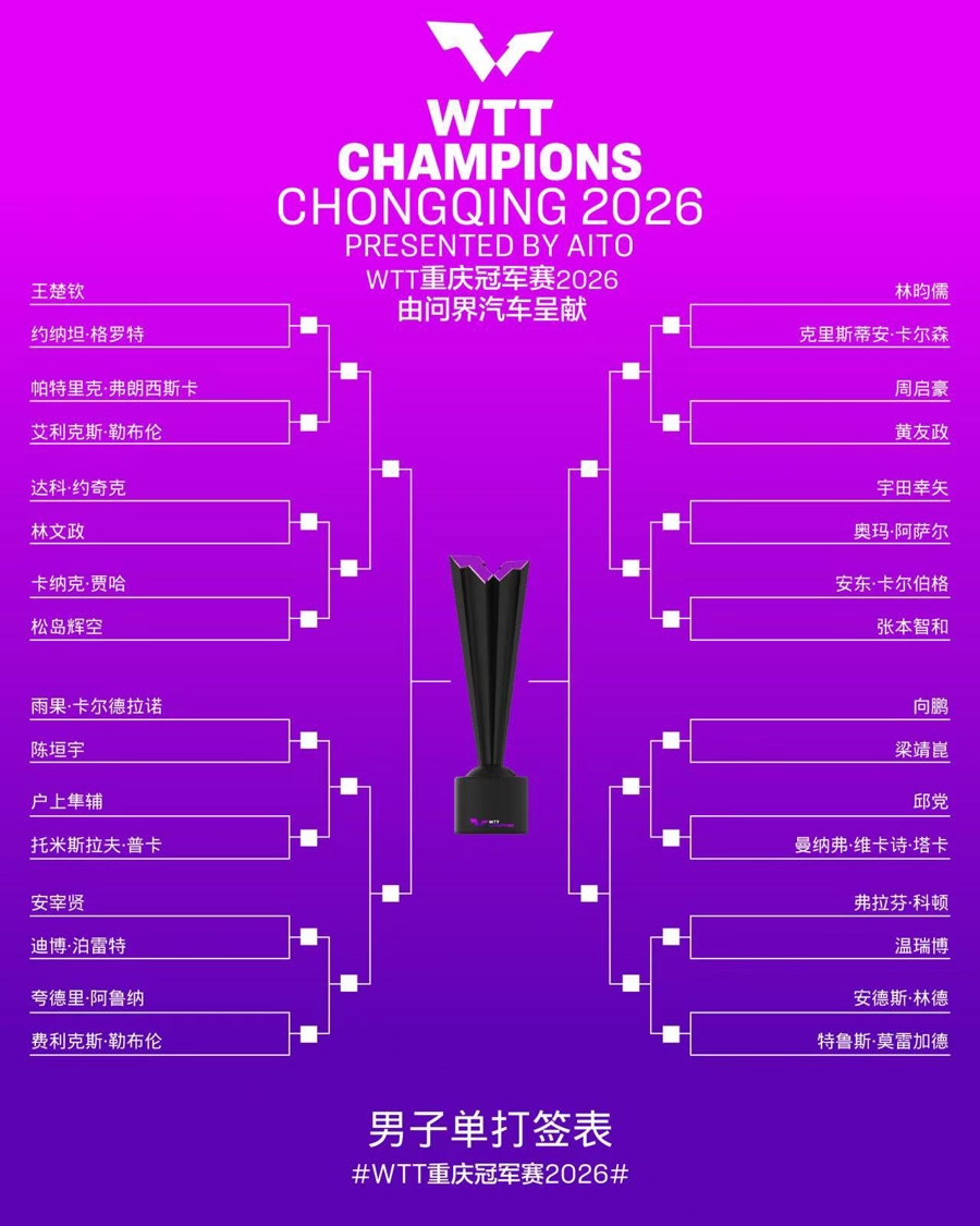 2026WTT重庆冠军赛将于3月10日拉开战幕,卫冕冠军王楚钦、孙颖莎领衔男乒7男7女的豪华威望出战。8日,对阵签表出炉, 国乒男队遇到“最调皮分组”,两场内战将在首轮提前献艺。
