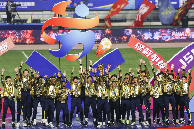 2025年11月1日,冠军泰州队在授奖庆典上庆祝。\n 当日,在江苏南京举行的2025江苏省城市足球联赛(“苏超”)决赛中,南通队与泰州队在惯例期间0比0战平,通过点球大战,泰州队总比分4比3驯服南通队,夺得冠军。\n 新华社发