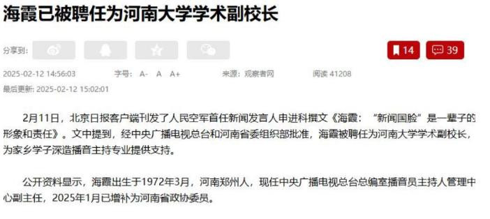 第二个新身份,是河南大学学术副校长。2025年,经中央播送电视总台和河南省委组织部批准,海霞被认真聘任为河南大学学术副校长。这一职务并非虚名,而是实真实在的实职,她分摊新闻与传播学院、人人卫生学院,积极参与学校的学科设立和惩办使命,为家乡的栽植奇迹贡献我方的力量。