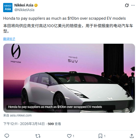 当汽车制造商决定中止接近量产的车型拓荒时,常常需要向仍是为坐褥线准备确立和东说念主手的零部件供应商支付抵偿,以遮蔽其过问老本以及因失去异日订单而损失的预期利润。因此,本田这次需要向供应商支付最高达1.7万亿日元(现汇率约合735.9亿元东说念主民币)的抵偿金。