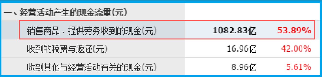 第二个反差:销售商品收到的现款总和1082.83亿,同比增长53.89%,还高于营业收入,现款流极其健康。
