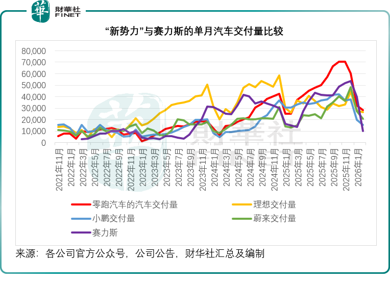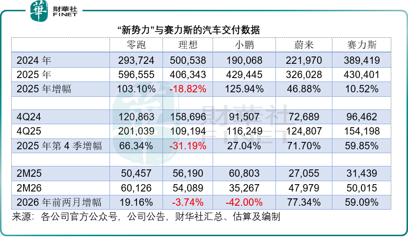 2025年,赛力斯全年托付43.04万辆,同比增长10.52%,增速虽不足小鹏、零跑、蔚来,但保持肃肃增长;2026年前两个月,累计托付5万辆,同比增长59.09%,开年进展强劲,销量端具备一定韧性。