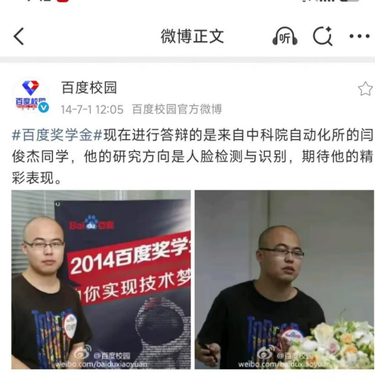 2014年,25岁的闫俊杰插足百度AI联系院实习,并拿到了百度奖学金。