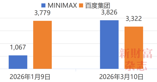 1月9日,MiniMax上市本日,收盘市值为1067亿港元,彼时不到百度的1/3。至3月10日,上市两个月,已反超百度500亿港元(图1)。