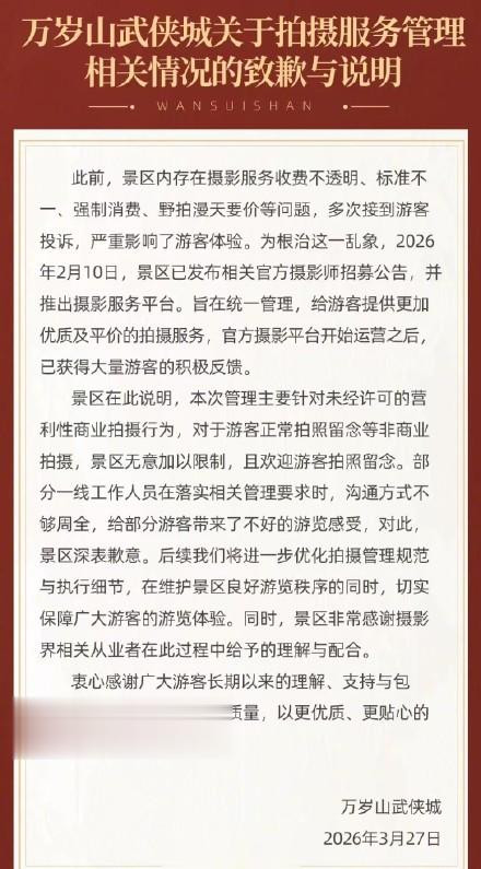 3月26日,河南搭客沙先生向媒体响应,他与细君在万岁山景区游玩,用我方佩戴的专科相机给细君拍相片霎,3次被不同的责任主说念主员进击、驱离。沙先生称,斡旋景区打击“黑拍”宰客的初志,但他依然讲授是佳耦相关还被进击,影响游览体验。@封面新闻对此报说念后,事件登上热搜,激励网友凡俗争论。27日中午,万岁山景区对此发布致歉与评释进行回报。景区回报称:此前,景区内存在照相作事收费不透明,法子不一,K8凯发官网强制浪费,野拍漫天要价等问题,屡次接到搭客投诉,严重影响了搭客体验。为根治这一乱象,2026年2月10日,凤凰彩票官网首页景区发布有关官方照相师招募公告,并推出照相作事平台。旨在合并贬责,给搭客提供愈加优质及平价的拍摄作事,官方照相平台驱动运营之后,已取得多半搭客的积极反馈。此贬责主要针对未经许可的牟利性贸易拍摄作为,关于搭客浮浅拍照眷恋等非贸易拍摄,景区意外加以鸿沟,且接待搭客拍照眷恋。部分一线责任主说念主员在落实有关贬责条目时,疏浚容颜不够玉成,给部分搭客带来了不好的游览感受,对此,景区深表歉意。后续咱们将进一步优化拍摄贬责程序与实施细节,在爱戴景区细致游览步骤的同期,切实保险雄伟搭客的游览体验。“事情发生后,有网友质疑我是炒作,发起了网暴。万岁山的回报就特别感性。”沙先生暗示,对万岁山的回报实质斡旋、剿袭,也但愿万岁山能继续被越来越多的搭客心爱。