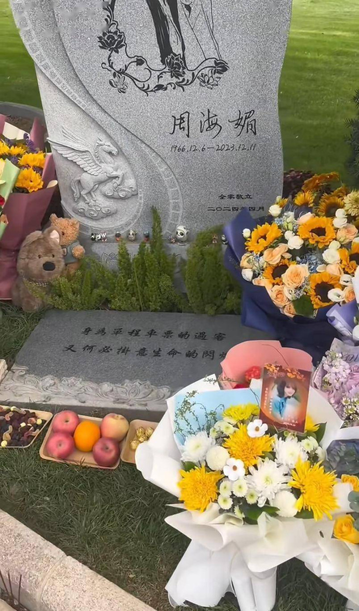 墓碑下方的大理石盖板上摆放着许多小摆件,这些齐是粉丝们寄来的操心品,其中最多的是熊猫和狗狗。周海媚生前最可爱熊猫,家里还曾养过两条金毛犬,这也成为了她心底最难以割舍的东西。墓碑的棺盖上,刻着一段笔墨:身为单程车票的过客,又何苦挂意人命的精通。这句话深远揭示了周海媚对待人命的格调,既秀逸又平缓。