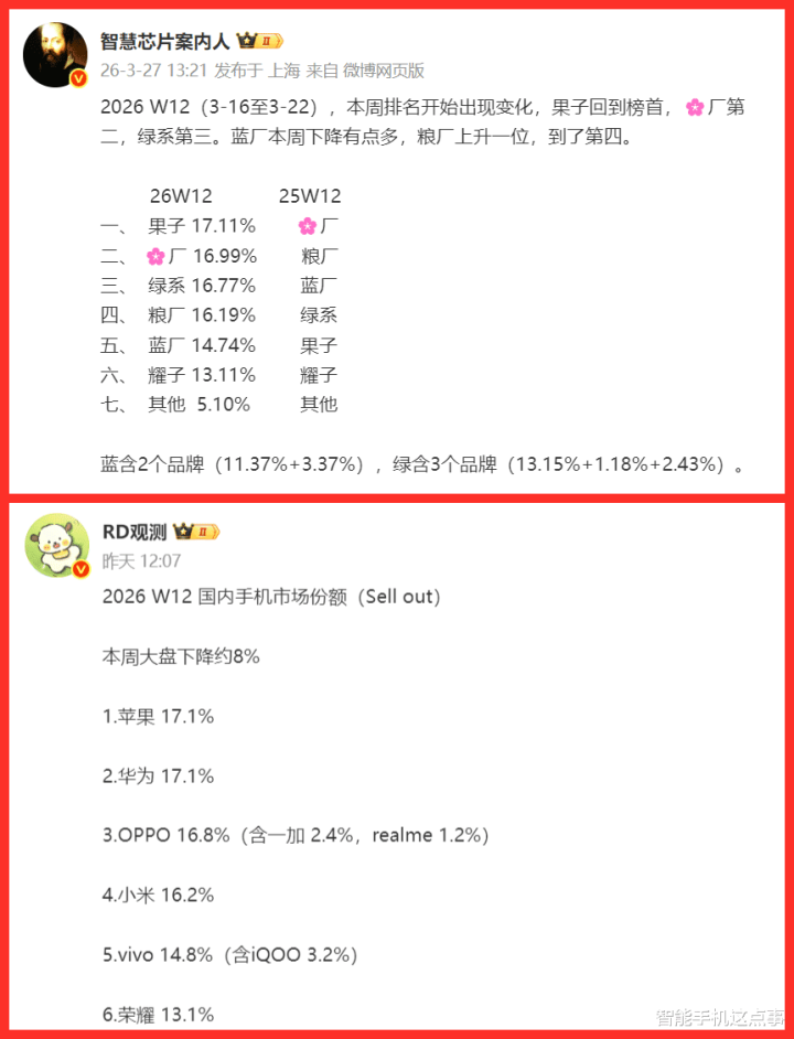 vivo第12周份额14.74%,跌至第五,这个落差很大,讲解vivo在3月中下旬的销量澄莹下滑,毕竟X300 Ultra和X300s要到3月30日才发布,2月靠X200系列和S系列撑场,新品空窗期导致份额被挤压。