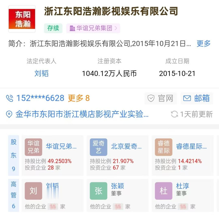 于是顺着出品方悉数深挖,径直挖到了浙江东阳广阔影视文娱有限公司。